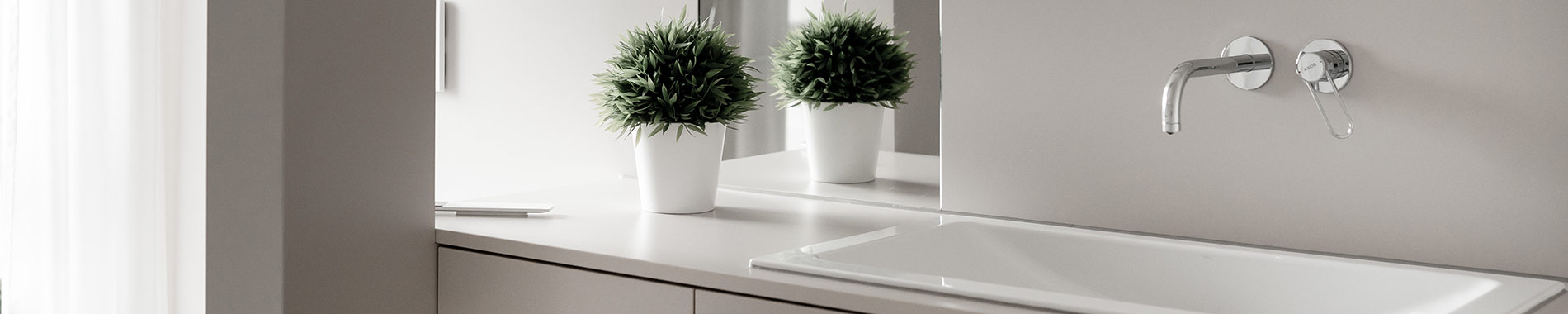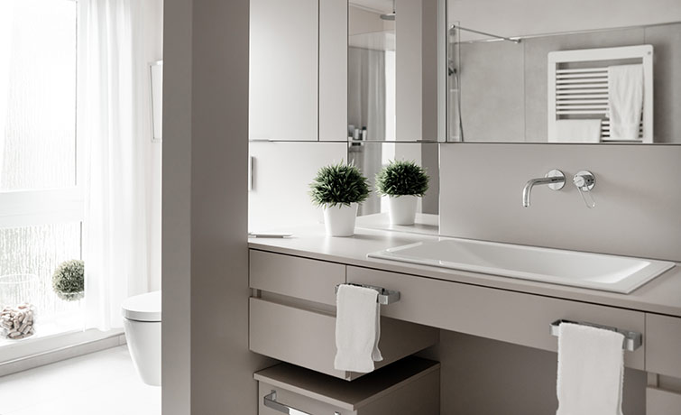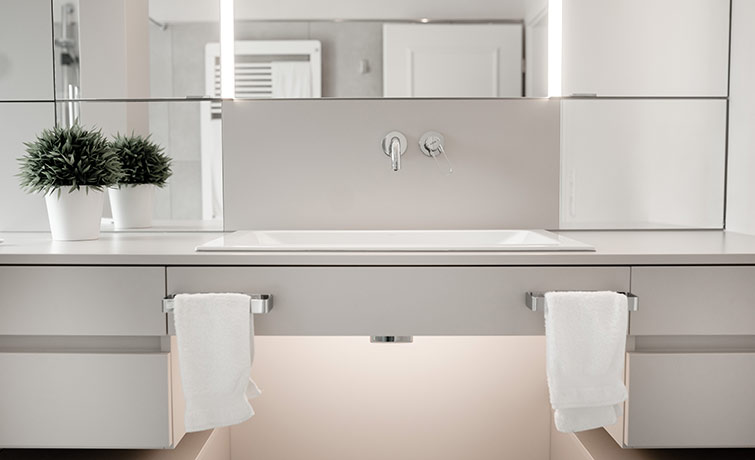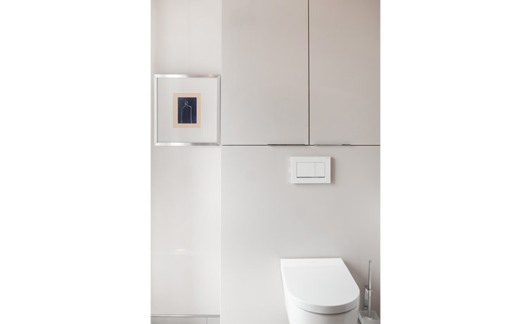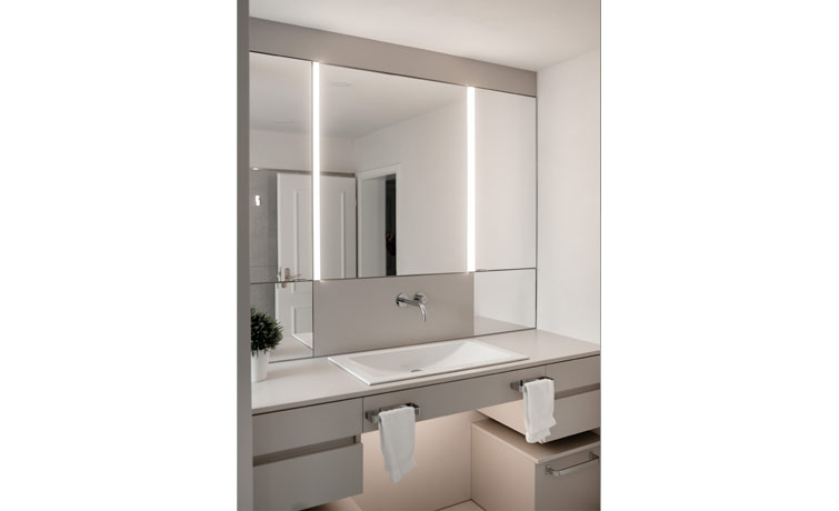 Helle, neutrale Farben dominieren die Flächen und lassen den Raum elegant und edel erscheinen.