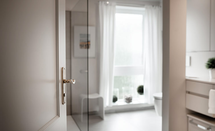 Der sehr großzügige Duschbereich überzeugt die Bewohner genauso wie die auf Maß gefertigten Einbaumöbel.