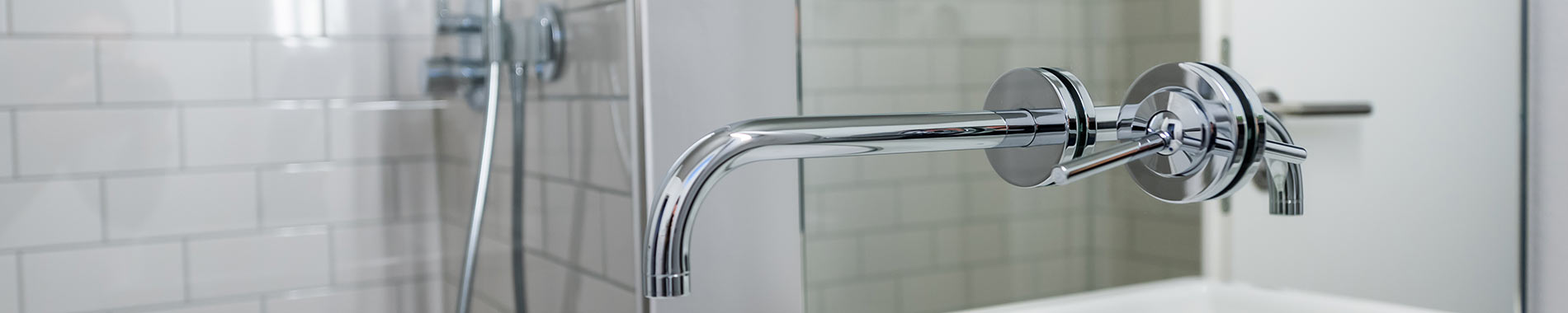 Die Fliesen im Spritzwasserbereich wurden im Halbverband verlegt und wirken durch das Längsformat wie eine gemauerte Wand.