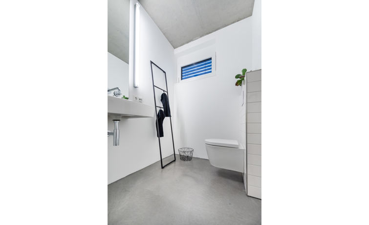 Über dem Waschtisch wurde ein schmaler, hoher Spiegel angebracht, die Armatur sitzt direkt innerhalb der Spiegelfläche.